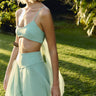 O Top Wind Martu por Manu Tepedino é um cropped minimalista com alças finas, recorte lateral profundo e ampla faixa esvoaçante atrás, trazendo movimento leve e um efeito etéreo à produção. Confeccionado em tecido acetinado verde água, oferece caimento perfeito, frescor e sensualidade discreta de verão.
