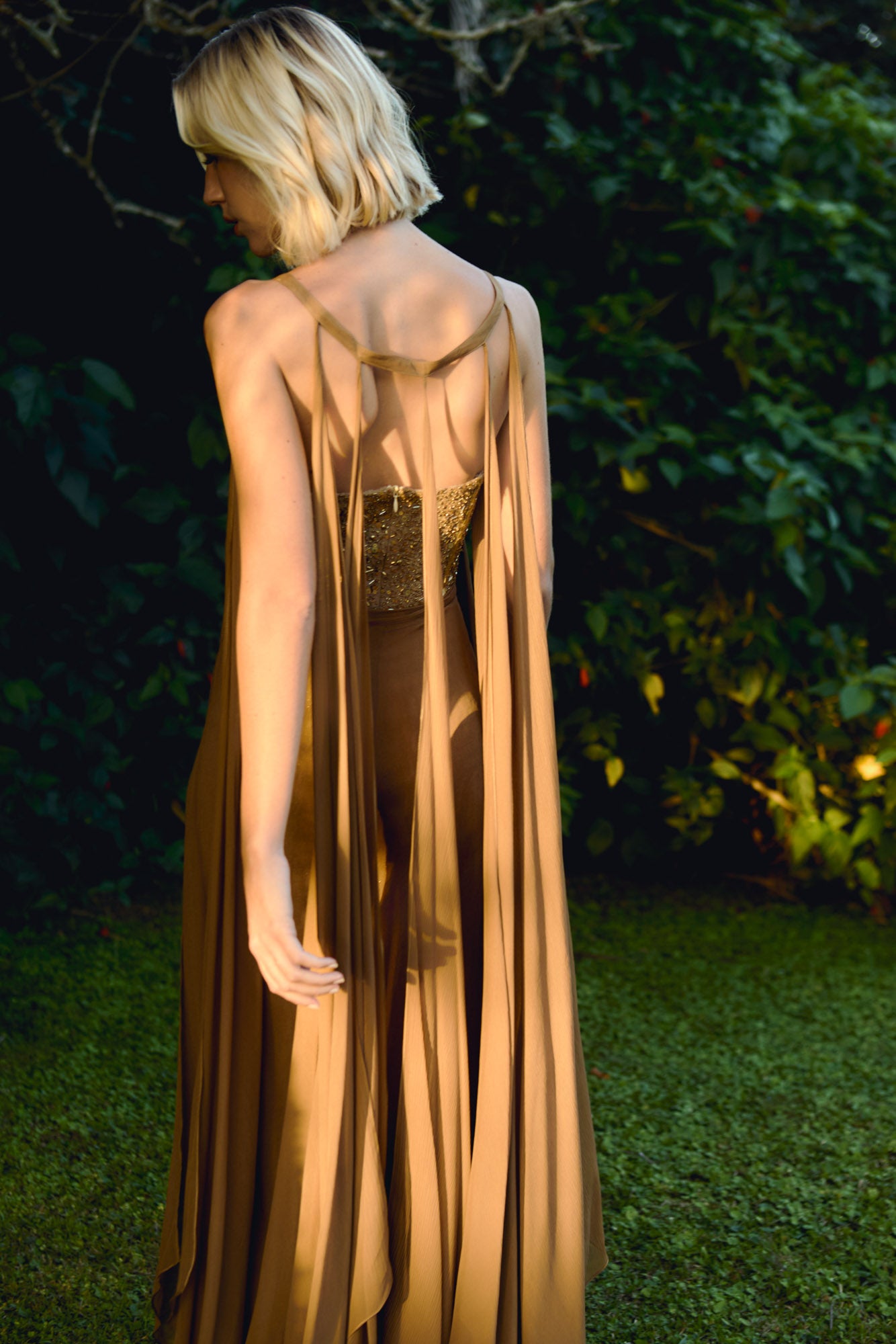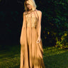 O Macacão Oasis exala sofisticação e movimento: o bustier bordado em paetês dourados é combinado com ampla pantalona de tecido leve modelagem aladin, trazendo cintilância delicada e fluidez para noites quentes e eventos de verão. As faixas de gaze criam efeito dramático na silhueta e valorizam o corpo com leveza.