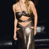 O vestido metálico Aura é uma celebração da sensualidade contemporânea, com recortes estratégicos e tecido com brilho líquido dourado, que destaca as curvas de maneira hipnotizante. As amarrações delicadas valorizam a cintura e criam uma geometria impactante, enquanto a saia longa fluida garante presença sofisticada.